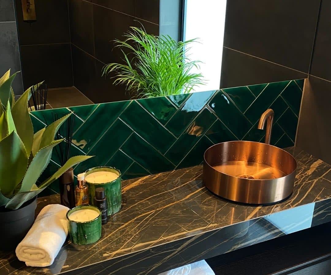 Familien Nordbom-Strand fra Manstad, har valgt dramtiske toner og dype farger til sitt drømmebad. De valgte å mykne opp Betonmetal flisene med grønne planter og luksuriøse kobberdetaljer fra Gessi, for å skape den perfekte atmosfæren på badet.