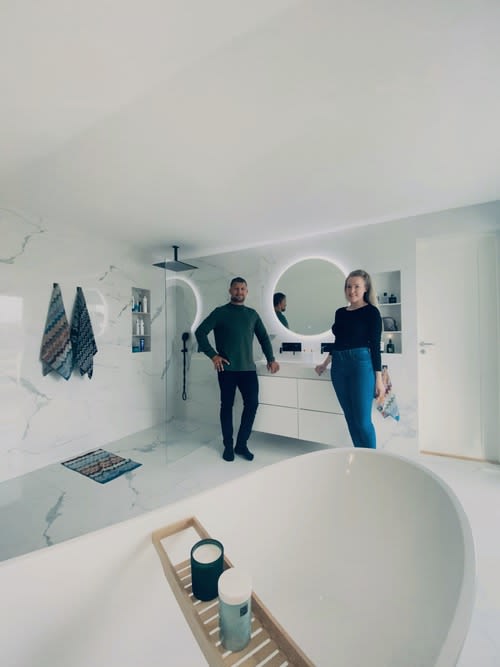 - Den romslige planløsningen, med mye naturlig sollys og de store marmorflisene gjør badet vårt lyst og delikat.