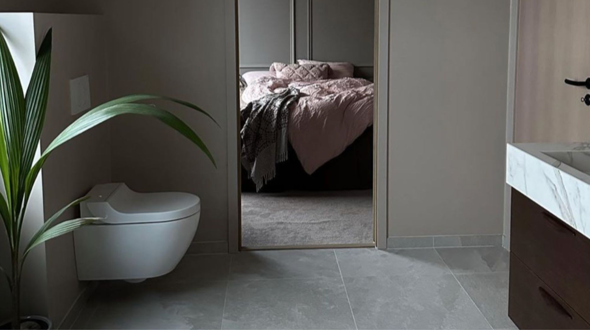 I det selvtegnede huset til Stine, bak Instagram-profilen @badet_pa_loftet, har de tatt interiørdesign til nye høyder ved å bruke våre "Rock Salt" fliser i det imponerende formatet 120x120 cm. Dette dristige valget ga dem muligheten til å skape et unikt baderom som utstråler en varm og moderne stil.