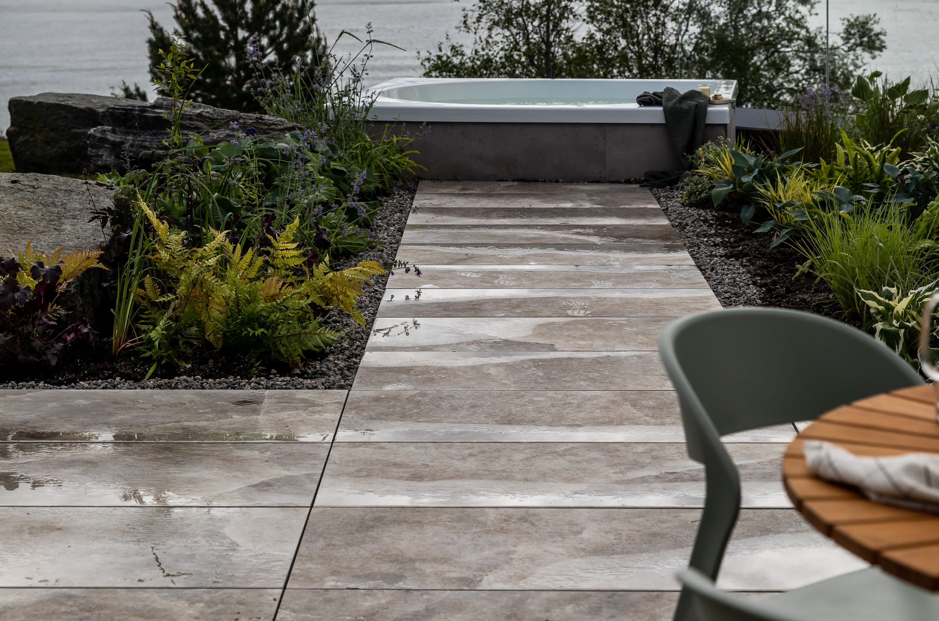 Designer Janne Narvestad fra "Herlige Hager", valgte flisheller til deler av dette prosjektet. Valget endte på vår best selger "Rock Salt" fliser i fargen "Danish Smoke" med 20 mm tykkelse. De er slitesterke, allsidige og gir et naturlig utseende til hager, terrasser, gangstier og andre utendørsområder.